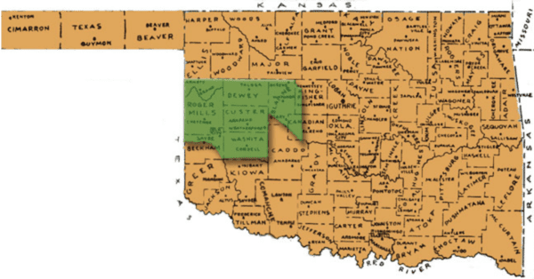 My great-great-grandfather’s family may or may not have participated in one of the Oklahoma land rush that “redistributed” Cheyenne and Arapaho land to white people. What I do know is that in 1887, the family was in Clay County, Kansas, and by 1900, they were in Watonga, Blaine County, Oklahoma, which is the right side of that green area denoting the land included in the third land rush of 1891.